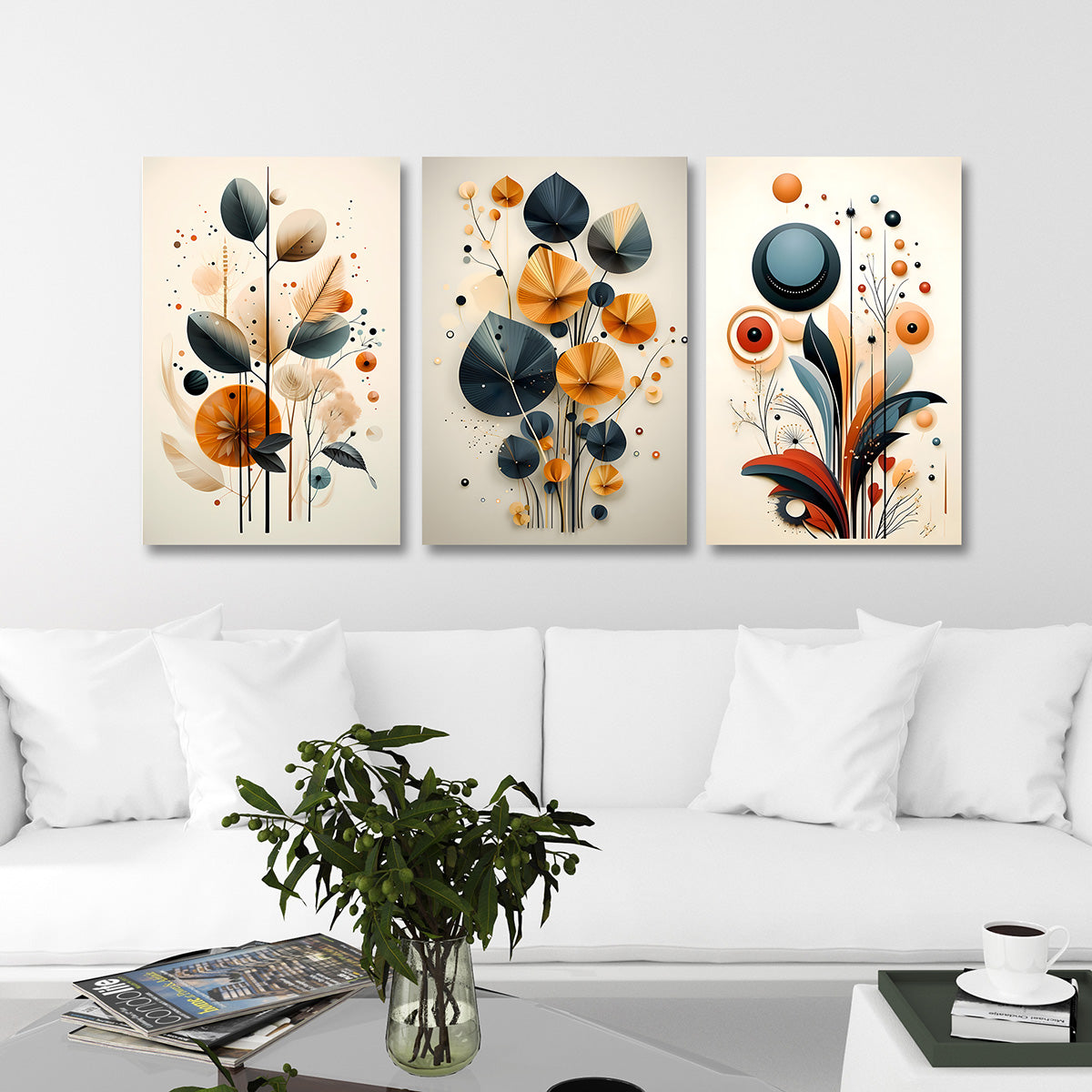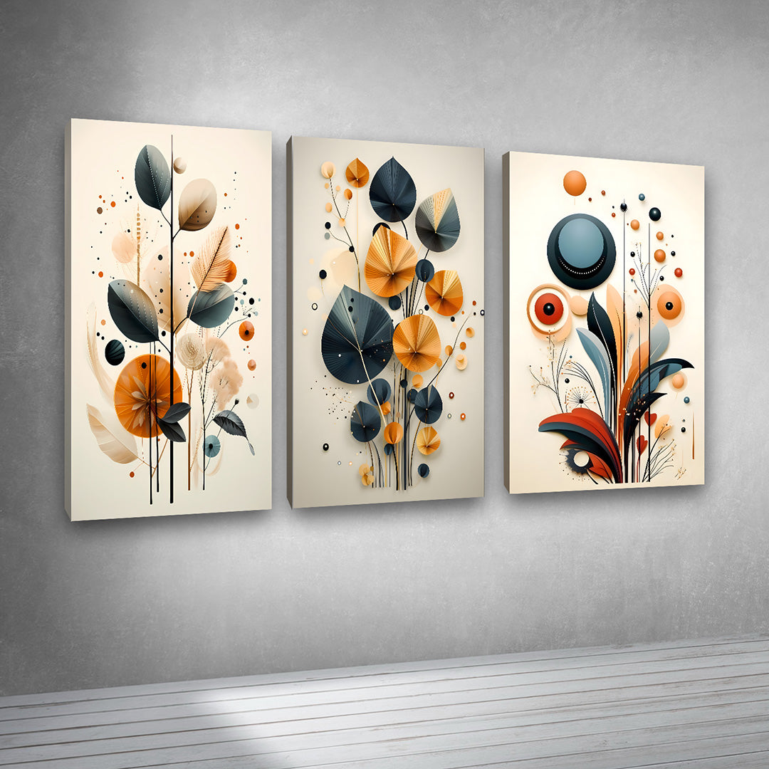 Transform your space with this abstract botanical geometric wall art set of 3 panels. Featuring a unique blend of stylized leaves, circular geometric elements, and modern floral patterns, this canvas artwork adds depth, creativity, and sophistication to any interior.
