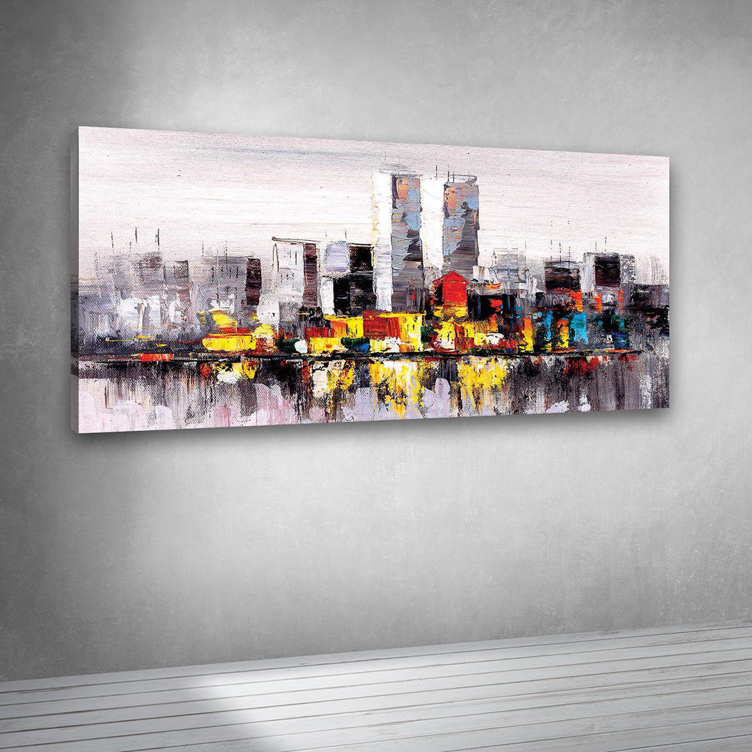 This abstract city skyline canvas wall art showcases a modern urban landscape painted with expressive textures and bold reflections. The cityscape wall painting features high-rise buildings, colorful structures, and mirrored reflections, creating a dynamic and contemporary visual appeal ideal for modern interiors.