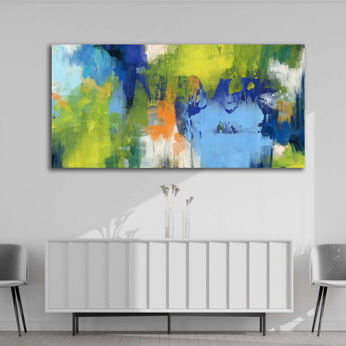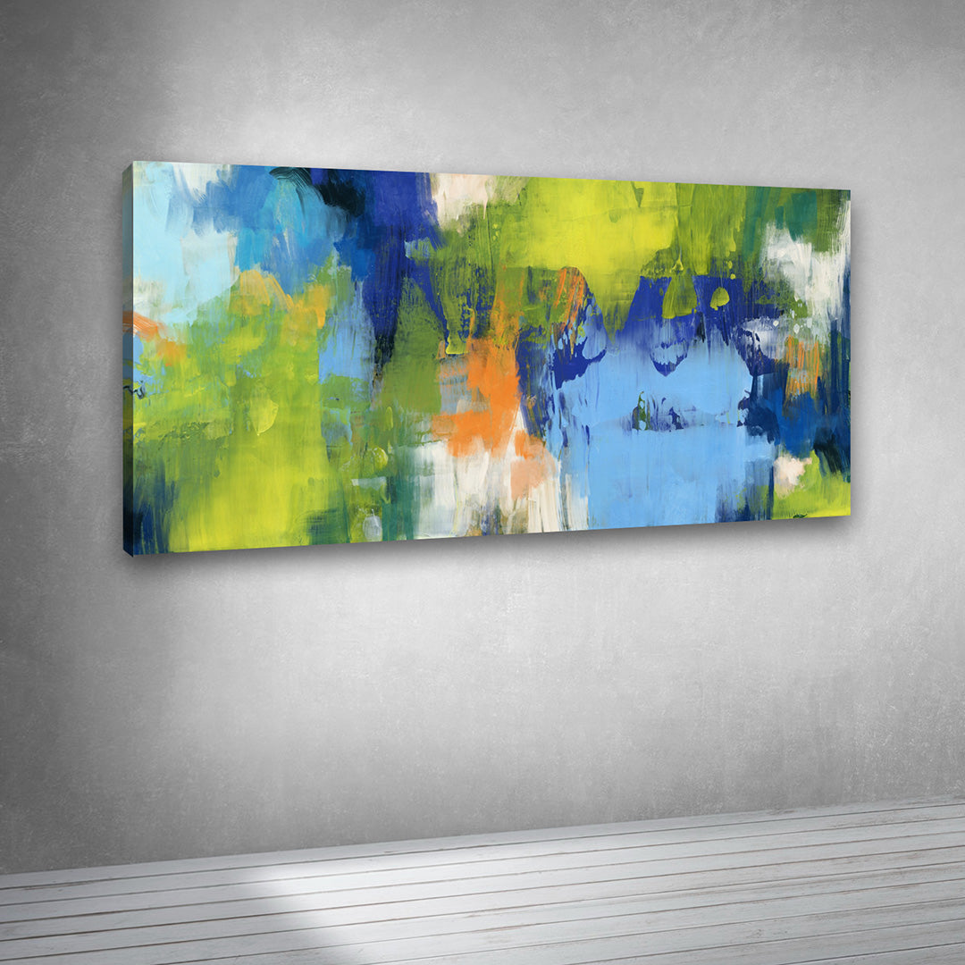 This colorful abstract landscape canvas painting wall art is a vibrant expression of modern creativity and contemporary design. Featuring bold strokes of blue, green, yellow, and hints of orange, this abstract canvas painting adds energy and freshness to any interior space. The artistic brush textures and layered color transitions make it a perfect modern wall painting for stylish homes.
