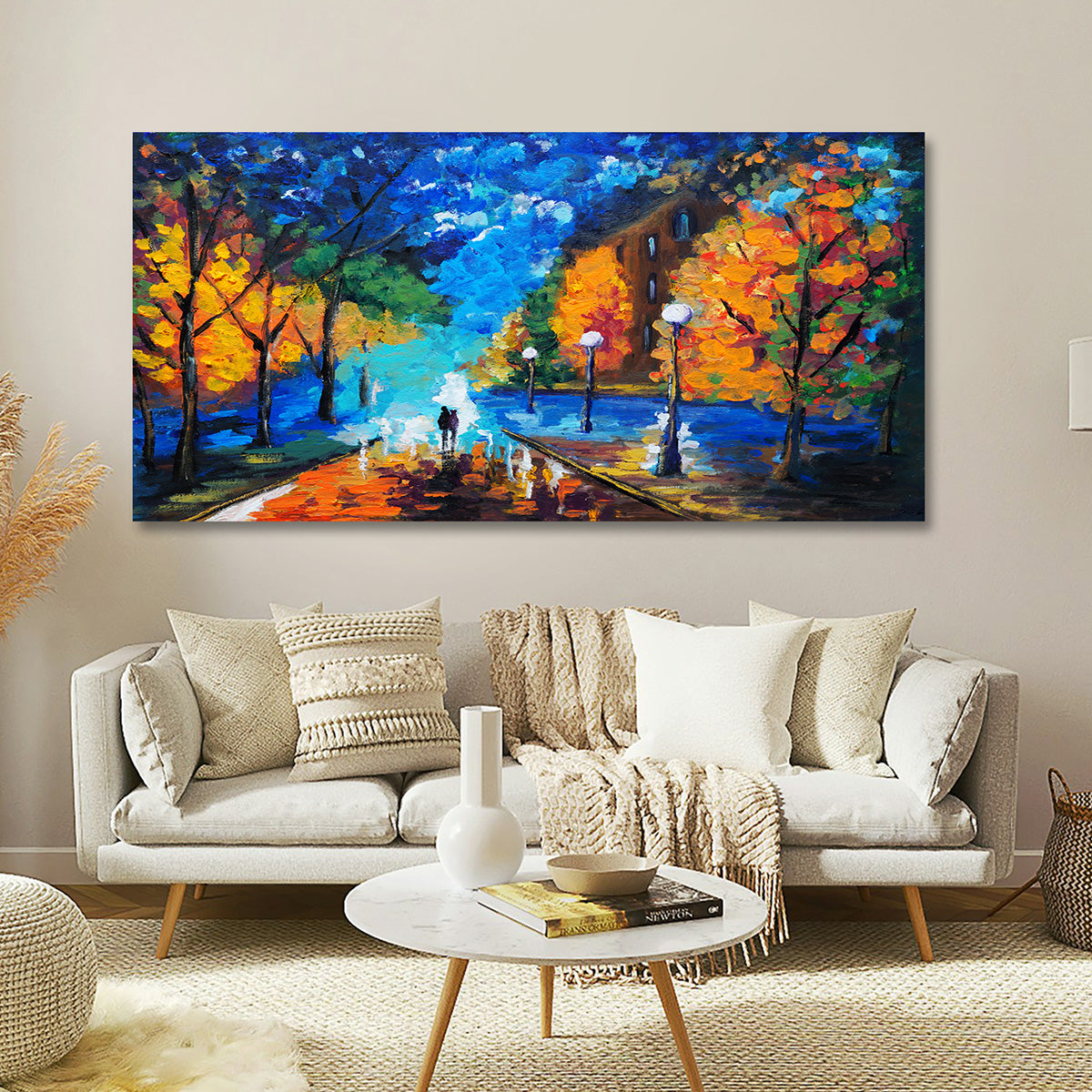 This modern landscape painting beautifully depicts a serene park pathway illuminated by street lamps, surrounded by autumn trees in full color. The textured brush strokes and expressive style give this cityscape canvas art a dynamic and artistic appeal, perfect for adding personality to your living room wall decor.