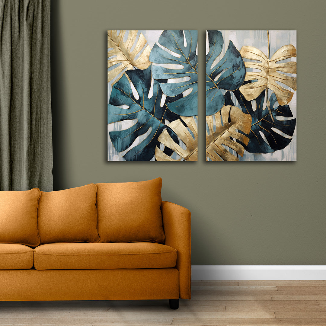 Perfect for those searching for monstera leaf painting, botanical wall art, tropical canvas decor, and modern leaf wall decor, this two panel canvas artwork adds depth and character to living rooms, bedrooms, and office spaces. The gold accents enhance the richness of the design, making it ideal for contemporary and luxury interior themes.